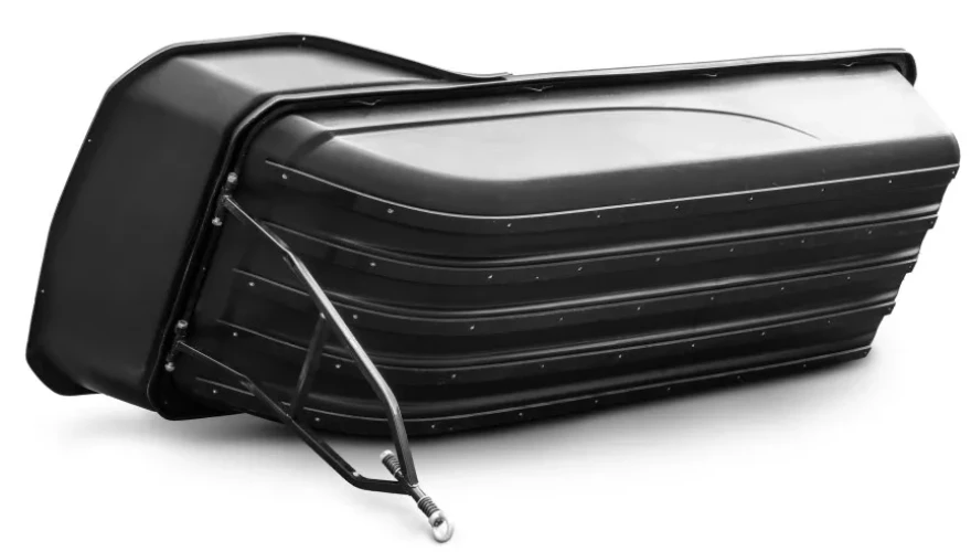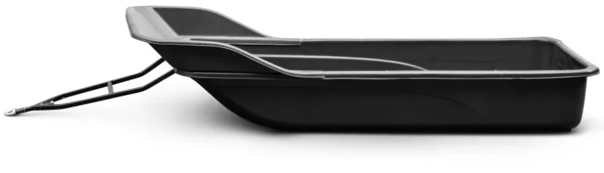 The front of the sled has a drawbar with a shock absorber for towing, front part of the sled is higher, providing excellent protection for both cargo and passengers from snow and wind. Made of very durable plastic material. Plastic protective strips are riveted under the carriage.