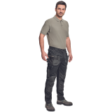 men's work pants with elastic waist; flexible innovative fabric TRIFIBETEX; durable triple seams in the legs and crotch; Oxford 600D reinforcement in the knee area; the possibility of placing traffic guards; roomy multi-functional front pockets with tool strap; reflective details in a dark tone; extendable leg length.