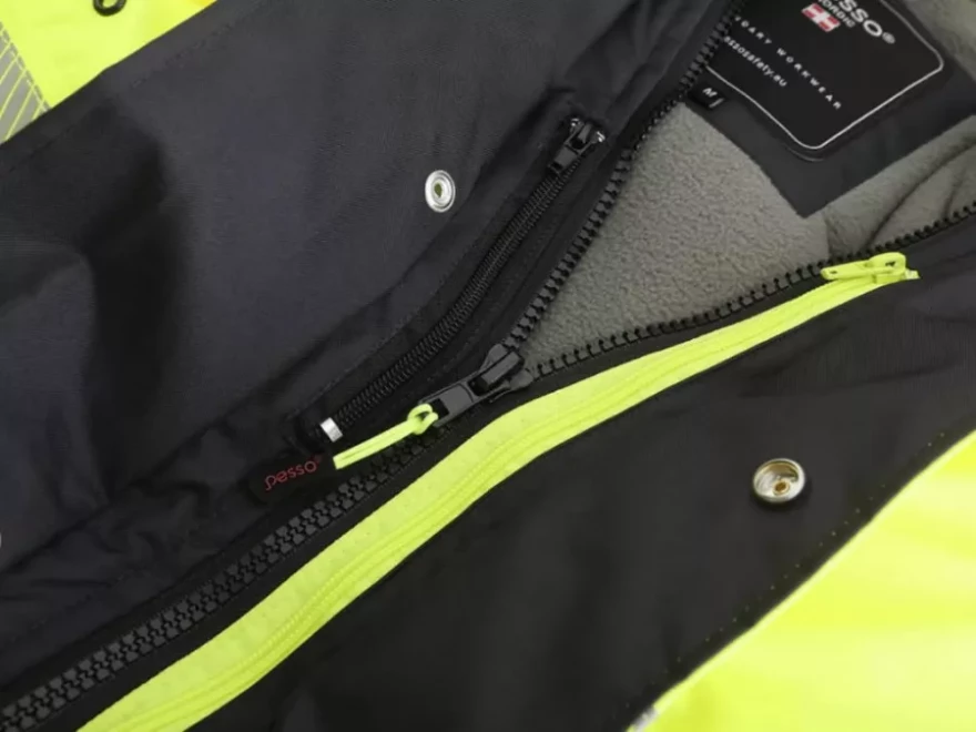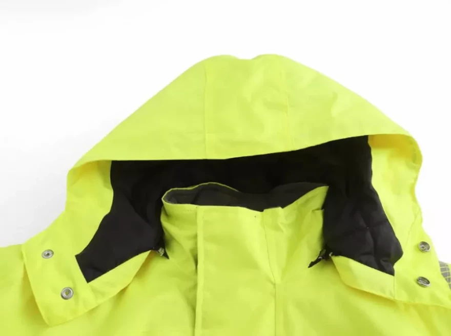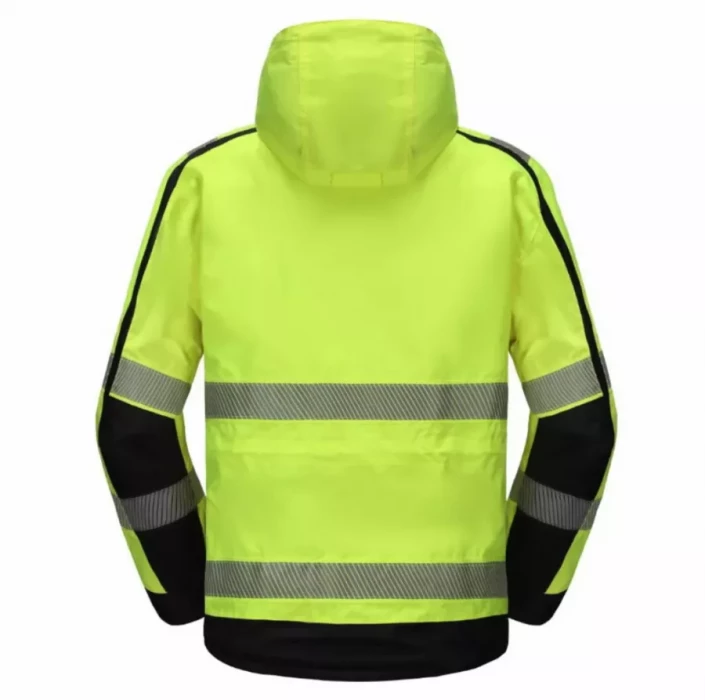 Material: 100% polyester lining, outer layer 100% polyester, lining 100% polyester. Resistance to moisture penetration: 8000mm. Moisture evaporation from the inside: 5000g / m2 in 24 hours. Standards: EN ISO 20741, EN 343, EN 342 CE. Wind and water resistant and breathable high visibility jacket. A modern, comfortable model that does not restrict freedom of movement. Double seams for extra strength. Durable, water-repellent outer material. PE fabric. Warm lining. Large two-way zipper. Flap fastened with press studs. Removable large, warm hood, adjustable with a drawstring. Collar - raised, with press buttons. Adjustable cuffs with snap buttons. 5 cm reflective tape.