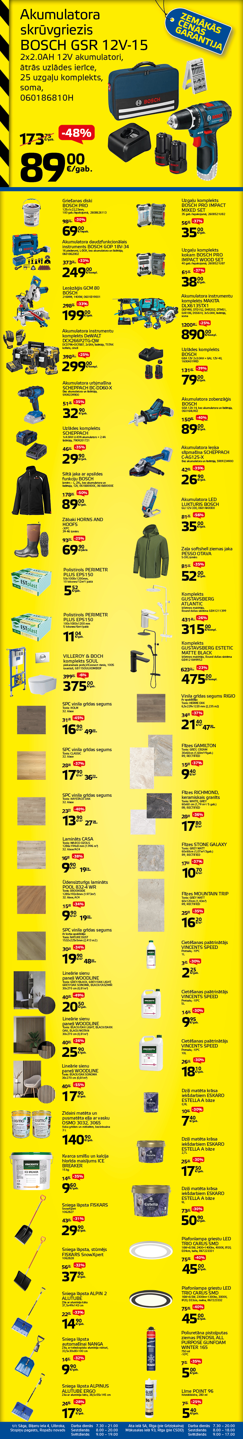 Garantētā zemākā cena Instrumentu komplektam - Akumulatora skrūvgriezis GSR 12V-15, komplektā 2x2.0Ah+ lādētājs+25 uzgaļu komplekts+soma BOSCH 060186810H, kas ir 89.00 EUR par vienu gabalu un Instrumentu komplektam.