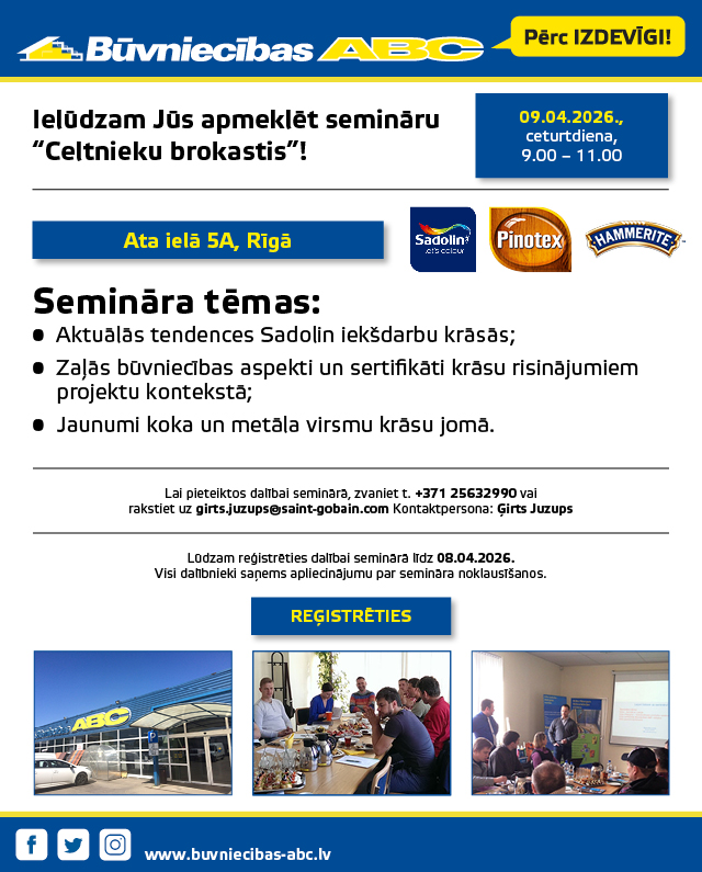 Ielūdzam Jūs apmeklēt semināru 09.04.2026. sadarbībā ar SADOLIN