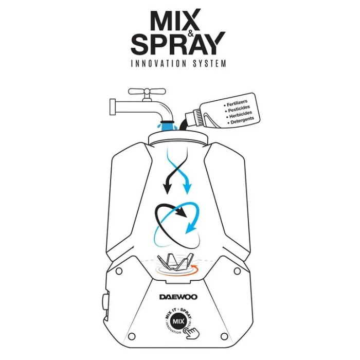 Inovatīvā MIX&SPRAY funkcija – papildus sūknis rada plūsmu, kas sajauc ūdeni un ķīmiskos līdzekļus tieši izsmidzinātāja tvertnē.