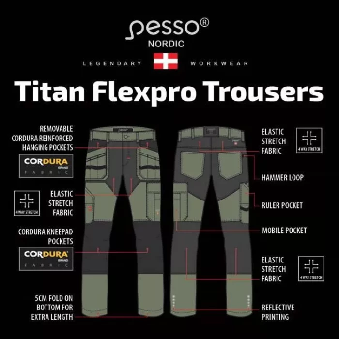 Pesso darba bikses ir izgatavotas no īpaši izturīga auduma ar leģendārā Cordura® materiāla detaļām, ilgākai kalpošanai un 4-virzienos elastīga materiāla iešuvēm - lielākai kustību brīvībai.