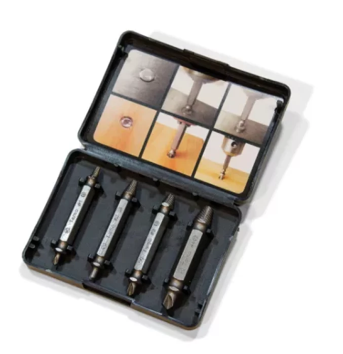 Vienkāršs veids, kā izņemt bojātas skrūves. Komplektā ietilpst 4 dažādi izmēri ar urbi un skrūves galviņu. Vispirms ar urbja galviņu izurbiet caurumu bojātajā skrūvē. Izmantojiet skrūves galviņu, ievietojiet to caurumā un izmantojiet to, lai izņemtu skrūvi.