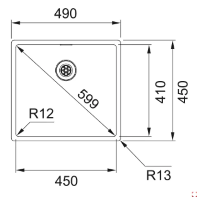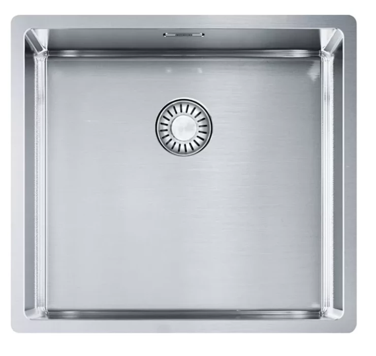 BXX 210/110-45 Franke Box sērijas pulēta nerūsējošā tērauda izlietne, universāla montāžā, 490x450mm, bez žāvēšanas virsmas, integrēts ekscentra ventilis 3½" ar apaļu nerūsējošā tērauda vadības pogu, integrēta pārplude, bez maisītāja cauruma izlietnē, ar ventili komplektā