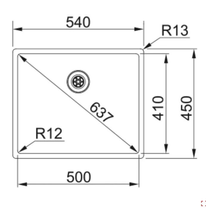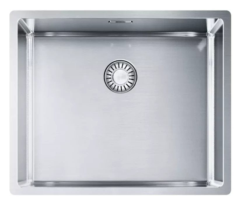 BXX 210/110-50 Franke Box sērijas pulēta nerūsējošā tērauda izlietne, universāla montāžā, 540x450mm, bez žāvēšanas virsmas, integrēts ekscentra ventilis 3½" ar apaļu nerūsējošā tērauda vadības pogu, integrēta pārplude, bez maisītāja cauruma izlietnē, ar ventili komplektā