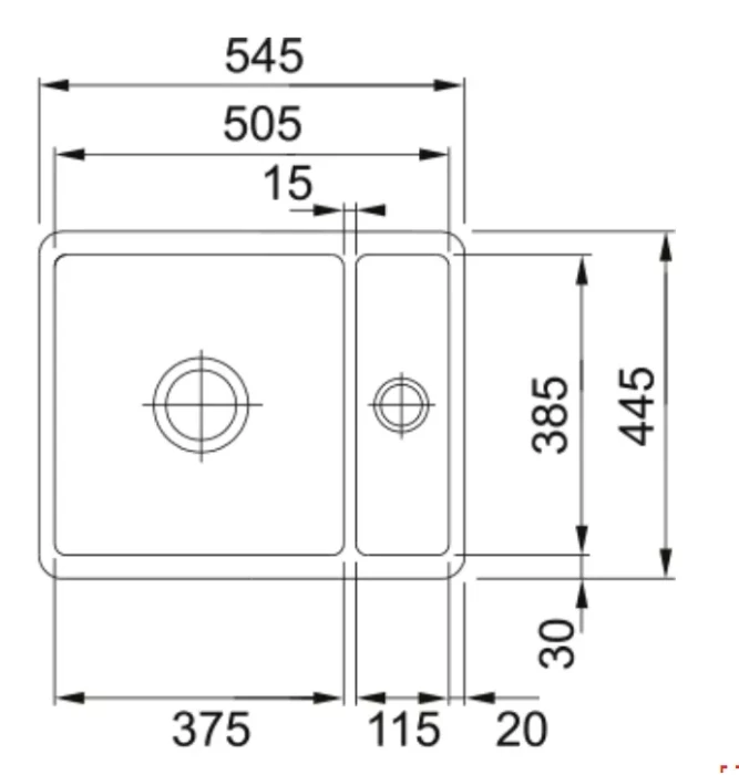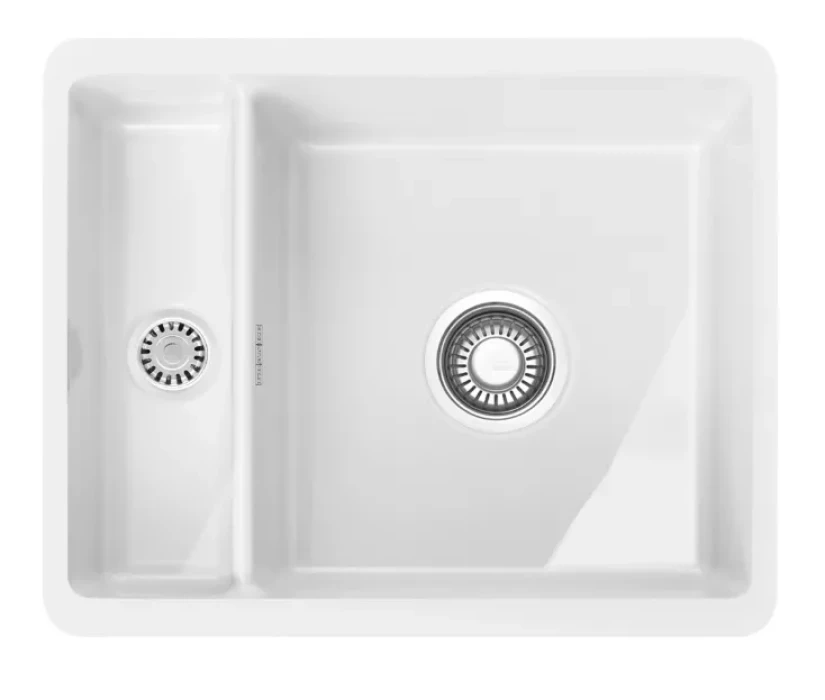 KBK 160 Kubus sērija pabūvējama keramiskā izlietne, 545x445mm, balta, ar 3½" ekscentra ventili vadāms ar nerūsējošā tērauda apaļu spiedpogu, mazai bļodai 1½" ventils, lielās bļodas izmērs 375x385mm ar 185mm dziļumu, ar ventili komplektā, bez maisītāja vietas izlietnē, Franke logo, iespējams pievienot atkritumu smalcinātāju.