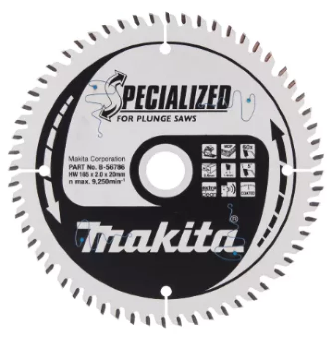 СПЕЦИАЛИЗИРОВАННОЕ пильное полотно диаметром 165 мм для резки МДФ, дерева и ламината. Подходит для использования с погружными пилами. Пильное полотно имеет 60 твердосплавных зубьев с передним углом 5°, шириной зуба (шириной реза) 2 мм и диаметром вала (диаметром вала) 20 мм.