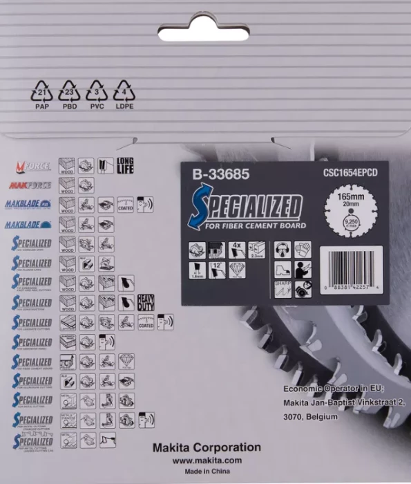 Пильное полотно 165 x 2,3 x 20 мм, 12° T4, для цементных плит T.C.T. MAKITA B-33685