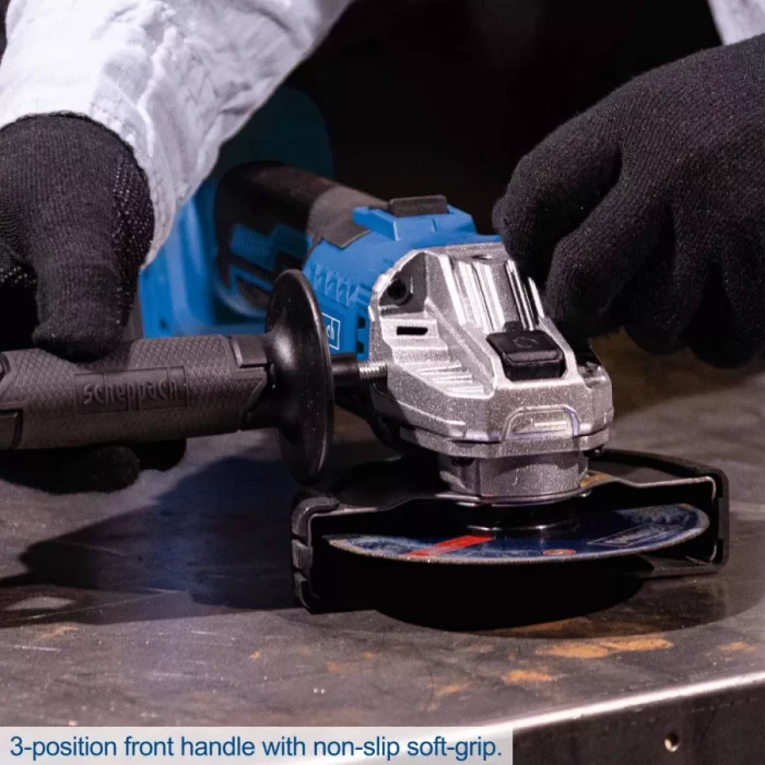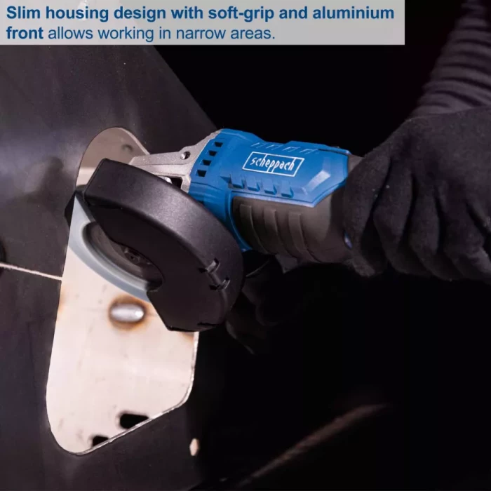 Работа без аккумулятора с серией Scheppach IXES 20 В — все аккумуляторы и зарядные устройства этой системы совместимы с этой угловой шлифовальной машиной.