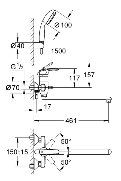 В комплекте: ручной душ Tempesta 100 II 9,5 л/мин (27 597), настенное крепление (28 605), душевой шланг Relexaflex 1500 мм 1/2" x 1/2" (28 151)